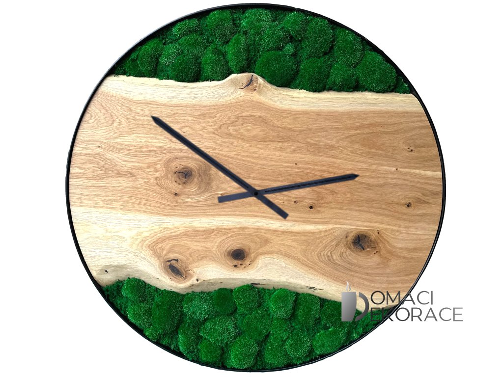 Designové hodiny v kovové obruči z ořechu evropského nebo dubu přírodního a stabilizovaného mechu (Islandský mech - tmavě zelený). Průměr hodin 35, 50, 60 nebo 100cm.